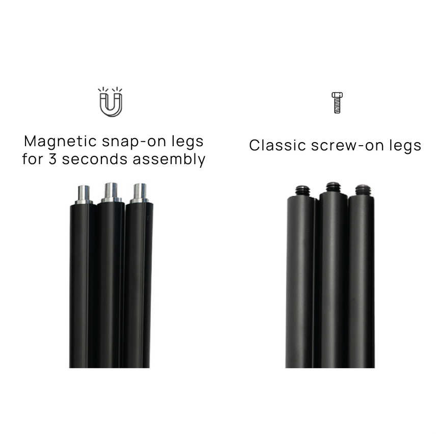 Choose the leg type: Magnetic snap-on legs for quick 3 second assembly, or classic screw-on legs.